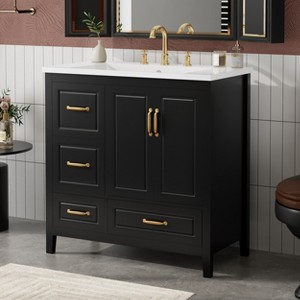 Upgrade your bathroom with this 36-inch freestanding vanity, blending timeless design and modern convenience. Its durable MDF frame and soft resin sink ensure long-term beauty and functionality. Gold-tone handles add elegance, while soft-close drawers and cabinets keep items neatly organized. With an open-back for easy plumbing and a straightforward assembly process, this all-in-one vanity is the perfect balance of form and function for any home renovation.
