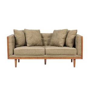 Bring home timeless appeal to create the perfect seating ensemble. Our loveseat brings a retro mid-century modern aesthetic to your interior space, easily anchoring your decor in an atmosphere of sophistication. Featuring charming button-tufted upholstery and a rich wood-like frame, this loveseat stands as a streamlined statement piece that can change the whole flow of your living room, creating an open, clean space. Finished with tapered wood legs and four plush accent pillows, our loveseat provides a refined touch to any home.