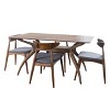 Modern meets natural to create a streamlined look for your dining space. With matching wood finishes, you can’t go wrong with this dining set. Including one table and four chairs, this set is ideal for any home. The mid-century style and smooth wood finishes of this set will complement any decor, making this a perfect addition for your interior space. The dining chairs feature a sturdy design with lovely upholstered seats that provide both comfort and style for your dining pleasure.