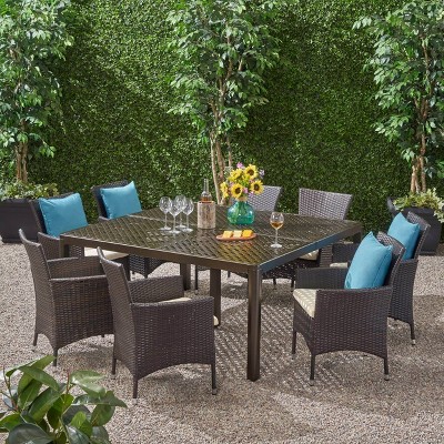 Christopher Knight Home Cayman Outdoor 9 Piece Traditional Cast Aluminum Mesh Dining Set with 61.25" Round Woven Table, Antique Matte Black