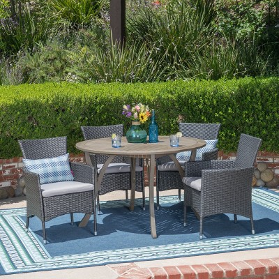 The beautiful blend of wood and wicker comes to life with this dining set. Complete with four wicker dining chairs and one wooden table, you can enjoy eating in your backyard whenever you want. The wooden table is treated to withstand even the harshest of seasons, ensuring your set looks great all year long. This set also comes with the added benefit of cushions for your seats, giving you the perfect color contrast, as well as the comfort that everyone wants when sitting outside for extended periods of time. The square table ensures that there is enough space for both food and people, meaning no one leaves the table hungry.