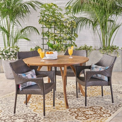 This clean and simple dining set combines durability and functionality to bring outdoor dining a dash of style and comfort. Complete with a table, and four dining chairs, this set offers cozy seating in the great outdoors for you and your family. Sure to complement any patio decor, this dining set offers you a stylish wicker design and cushioned chairs, guaranteed to give you a place to create memories over a hearty meal.