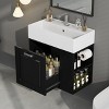 Refresh your bathroom with this 21.8-inch wall-mounted floating vanity, blending minimalist design and smart storage. Made from durable MDF and paired with a sleek ceramic sink, it offers easy maintenance and long-term performance. A spacious soft-close drawer keeps essentials neatly organized, while side shelves—complete with an integrated toilet paper holder—add functionality. With an open back for plumbing access and simple assembly, this all-in-one vanity delivers style, space-saving utility, and everyday convenience.
