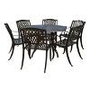 Impress your guests with a gorgeous dining set that gives your backyard or patio space an atmosphere of refined elegance. Featuring a beautiful classic look, our dining set opens any outdoor space into one of incredible design and texture. Made with cast aluminum and completed with an antique finish, this set functions as a unique centerpiece that easily seats six people. Finished with a convenient umbrella holder, this set provides you with a shaded option and ample space to enjoy endless summer days.