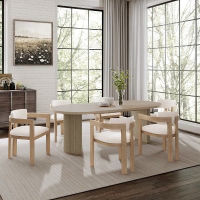 Bring rustic charm and durability to your dining space with this beautifully crafted rubberwood dining set. The natural wood grain finish and warm tones create a welcoming, farmhouse-inspired look, while the semi-cylindrical double pedestal base adds modern elegance with its vertical groove detailing. Each chair features cushioned, upholstered seating in a soft, linen-blend fabric that offers comfort and easy maintenance, perfect for everyday meals or festive gatherings. Built entirely from solid rubberwood with a refined wire-brushed finish, this set combines timeless design with long-lasting quality for style that endures.