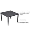 Introducing the Ember Black Outdoor Square Dining Table, the ideal choice for a stylish, durable addition to your outdoor space. With a 40"x40" frame, this dining table is crafted from lightweight, weather-resistant aluminum, offering long-lasting use without the worry of rust. The sleek, modern design features tapered post legs, giving the table a minimalist appeal that enhances any outdoor area. The table's safe, rounded corners provide an added layer of security while still exuding elegance. Designed with convenience in mind, it includes a built-in umbrella hole, perfect for adding an umbrella to keep cool in the sun. Additionally, non-slip nylon adjustable feet pads protect your floor and ensure stability, even on uneven surfaces. Whether you're enjoying a meal or relaxing with friends, this table is sure to impress and withstand the elements.