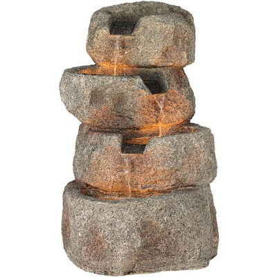 Bring elegance and tranquility to your outdoor space with this natural rock design fountain, featuring a faux-stone column with realistic layered textures that blend beautifully into gardens, patios, or courtyards. Built-in LED lighting softly illuminates the water stream at night, creating a warm and inviting atmosphere for relaxation or gatherings. The adjustable water flow allows you to customize the sound and speed of the cascade, while the durable concrete construction ensures stability, weather resistance, and long-lasting performance in any outdoor environment.