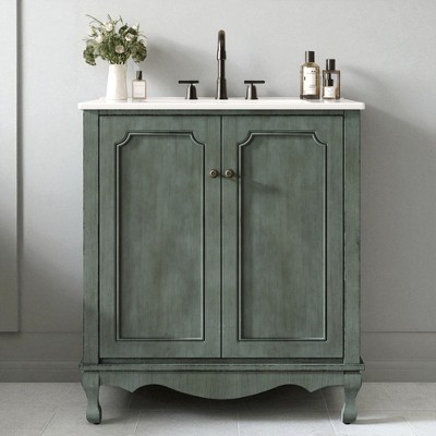 Elevate your bathroom with the 60-inch double sink bathroom vanity set, a perfect blend of vintage charm and modern functionality. This set includes two matching 30-inch vanities that can be installed together for a seamless 60-inch double vanity or separately for flexible layouts. Crafted with a antique finish and knobs, the double bath vanity add timeless elegance to traditional and farmhouse bathrooms. Each freestanding bathroom vanity is topped with a rectangular ceramic sink that is water-resistant, scratch-resistant, and easy to clean, ensuring long-lasting durability. Adjustable storage shelves inside provide versatile organization for toiletries, towels, and cleaning supplies. Designed for shared use, the dual sinks minimize wait times and streamline morning and evening routines, making it ideal for family or shared bathrooms.