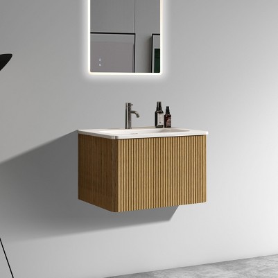 Redefine your bathroom with a sleek and sophisticated floating bathroom vanity. Featuring a rich striped walnut texture and a seamless glossy white integrated ceramic sink, this vanity perfectly blends modern aesthetics with practical functionality. Designed with safety in mind, the gently curved edges eliminate sharp corners, enhancing both elegance and peace of mind.