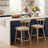 This set of 2 counter stools combines natural charm with modern functionality. Crafted from authentic light rubberwood with visible grain patterns, each stool offers a warm, organic look. The contoured cushions provide comfort for long periods of seating, while the ergonomic rubberwood frames support the back naturally. Sustainably sourced wood retains its natural color and texture, ensuring unique and environmentally conscious craftsmanship. Perfect for kitchen islands, home bars, or high-top areas, these stools fit seamlessly into diverse interior styles. Sold as a pair, they enhance both style and functionality, with durable construction and easy-to-clean upholstery for everyday use.