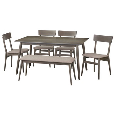 Frame Material: Acacia Wood+Iron+Rattan Cushion Material: Polyester Number of pieces: Four (4) Dining Chairs, One (1) Bench and One (1) Dining Table Chair Dimensions: 28.75''D X 24.50''W X 35.00''H Bench Dimensions: 14.50''D X 57.00''W X 18.00''H Table Dimensions: 31.50''D X 70.00''W X 29.50'H Assembly Required