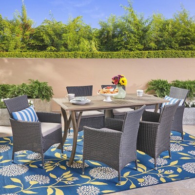 Become the perfect host for picnics and summer soirees. With seating for six, our luxurious dining set can help you create the ideal outdoor lounge area. Featuring a slat panel tabletop and lovely wicker seating, this collection is bursting with timeless sophistication. This set offers cozy cushions and an acacia wood table with gracefully curved legs, giving you a functional and cozy aesthetic to uplift any space.