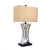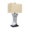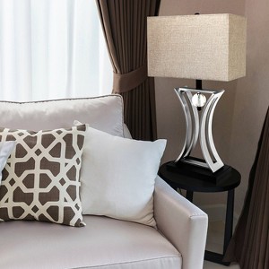 This modern 27.5" table lamp features an hourglass shape and pendulum design. The chrome finished body, matte black base, and commercial beige and gray rectangular shade complement this current look. This lamp will add a contemporary flair to any conference room, waiting area, or office. We believe that lighting is like jewelry for your home. Our products will help to enhance your room with elegance and sophistication.
