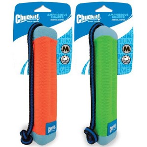 The Chuckit! Amphibious Bumper is the ideal fetching, floating toy for water-loving dogs. Featuring a buoyant memory foam and rubber construction, this floating dog toy allows exciting games of fetch by the pool or on the beach. The knotted, non-slip rope handle allows pet parents to keep a firm grip and easily direct throws during fetch. Durable for outdoor play, the rubber and foam construction withstands repeated throwing and catching for long-term use. The dog fetch toy's soft nylon exterior is gentle on dogs' mouths for comfortable catching and carrying. Designed with bright orange and blue colors, both pets and pet parents can easily spot the bumper dog toy in tall grass or on water, making the bumper an excellent addition to your dog water toys. Available in small and medium sizes, a wide range of dogs can enjoy fetch with the versatile Chuckit! Tri-Bumper.