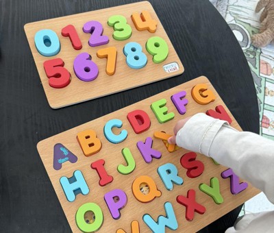 These are the perfect puzzles for my toddler who is learning the ABCs and numbers. I love the bright colors and the thick wooden pieces.