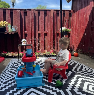 My 1.5 yr old has loved playing with this. He especially likes pouring water into the top cup and dumping it. The set up of the table is great. I love the size, the movable pieces, and the little boats. My only disappointment is that the spinners rarely spin when the water comes down.
