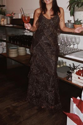 Step into the spotlight with the Ciao Ruffles Maxi Dress. This dress combines elegance and playfulness, making it the perfect addition to any wardrobe. The maxi length and v neckline create a silhouette that's chic, while the thin adjustable straps and invisible side zip ensure a tailored fit.