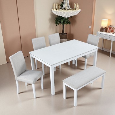 Upgrade your dining area with this modern 6-Piece Dining Table Set, including a spacious rectangular table, one padded bench, and four upholstered chairs—perfect for family dinners and friend gatherings. Built with a solid wood frame, the table delivers excellent stability and a 330 lbs weight capacity, while its rubber wood legs, plywood structure, and MDF-reinforced tabletop ensure long-lasting durability and easy cleaning. Both chairs and bench feature soft foam cushions wrapped in breathable linen fabric, paired with ergonomically curved backrests for optimum seating comfort. Non-slip footmats on every leg protect your floors from scratches, reduce noise, and boost overall stability. The set ships in 2 separate boxes (box1: table + bench; box2: 4 chairs) with numbered components and clear instructions, making assembly straightforward. With its clean two-tone (light gray & black) design, it complements any dining room decor seamlessly.