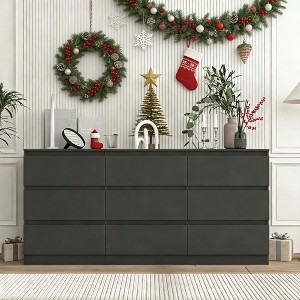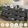 This modern minimalist black long dresser (59.1”W x 15.7”D x 28.3”H) boasts a classic solid color and compact design, perfectly interpreting minimalist style to blend seamlessly with any home decor as a timeless, versatile choice. It offers exceptional storage with 9 spacious deep drawers (19.4”L x 12.3”W x 7.3”H), each supporting up to 55 lbs to efficiently organize clothing, daily necessities, and large items, eliminating clutter, while the wide tabletop easily holds cosmetics, decorations, or a TV. Crafted from thicker particle board, it features a stable compact structure, a matte waterproof surface for easy cleaning, and high-quality metal slide rails for smooth, noiseless drawer operation. With a vertical 3D frame, seamless connections, built-in anti-tip device, and drawer anti-shedding mechanism, it ensures safe, long-lasting use for the whole family. Easy to assemble with detailed instructions, it also provides hassle-free returns and exchanges via customer service, seamlessly merging functionality, durability, and modern charm.