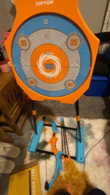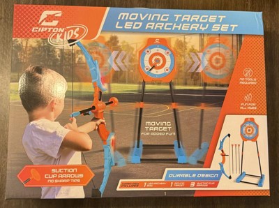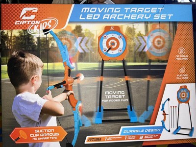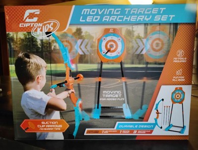 - Cipton offers a comprehensive entertainment solution for kids with our durable and high-quality bow and arrow set. It includes 1 bows with cool lights, 3 arrows, 1 standing moving target. Perfect for endless laughs and family outings! (Batteries not included.)
