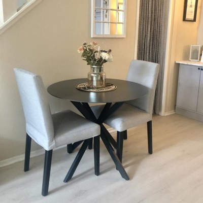 Great little table. Sturdy frame and glass top is easy to clean. Good size for 2 people but might be tight for 4 people although 4 chairs would fit around it. Packaging could be better but luckily the glass top was ok. One of the under metal frame had a little gash but it is not visible so I won’t return it. Thank you to the FedEx Lady who carried the package up the stairs to my front door!