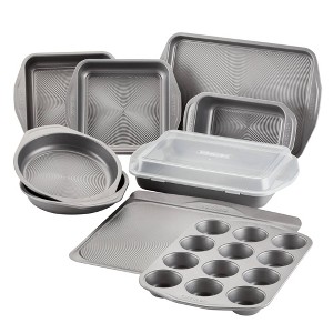 Get delectable color and sweet nonstick action with the durable, reliable Circulon® Nonstick Bakeware 10-Piece Bakeware Set. Superior nonstick technology and solution-driven design set Circulon bakeware apart from other nonstick bakeware. The technology begins with raised circles on the baking surface that are coated with premium-quality nonstick. Rolled-rim bakeware design provides warp protection and features wide handles for plenty of grip, even with bulky oven mitts. Oven safe to 450°F, and backed with a Hassle-Free Lifetime Guarantee, the nonstick bakeware set includes two 9-inch round cake pans, two 9-inch square cake pans, a 9-inch x 5-inch loaf pan, a 9-inch x 13-inch rectangular cake pan with lid, a 10-inch x 15-inch cookie pan, a 14-inch x 16-inch cookie pan, and a 12-cup muffin and cupcake pan. Get set for delicious baking convenience with the Circulon Nonstick Bakeware 10-Piece Bakeware Set, the perfect partnership of baking pans and performance."