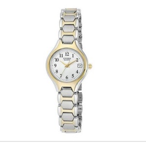 - This two-tone watch from Citizen is part of the Ladies Quartz collection. It is battery-operated, and features a round case with a bright palladium and yellow plating finish, paired with a two-tone stainless steel bracelet watch band with a jewelry clasp. It has a white dial with yellow-tone hands for a striking look that makes a statement. This unique watch is a perfect addition to any collection.