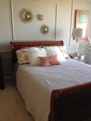 Ordered this quilt in King even though I have a queen size bed because the price was lower. After reading some reviews about how it may shrink, the king size worked out well and love the design. the color is Mink, so thing gray and beige, "grayge" and it goes well best with grays. very happy with the purchase rather than a boring solid. everything on my bed photo and hanging above my bed is all from Target except for lumbar pillow. Very happy with the final result.