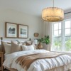 The charming chandelier features alabaster pieces in a round metal frame, bringing an elegant and simple appearance. Crafted from premium Spanish natural alabaster with original texture and distinctive veining, emits a warm and soft glow in your space. With a vintage brass finish, this drum chandelier complements modern, mid-century modern, and contemporary styles.