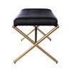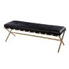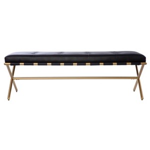 Refine your home with this modern upholstered bench. Tufted black faux leather creates a classic, tailored look, while the gold metal frame adds a touch of glam. The eye-catching, simple but sleek design instantly polishes a room while adding convenient function to your design. Place under a gold-framed mirror to bring sophistication to your foyer, or add this bench seat to the foot of your bed as a functional accent piece. Bring stylish seating where you need it most with this contemporary black bench.