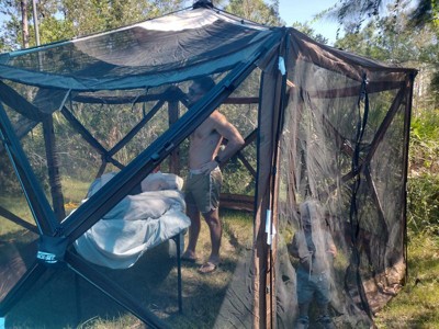 [This review was collected as part of a promotion.] Sets up really quick..A Definitely doable with only one person if it’s not too windy. If it is windy, make sure to stake it down and run the included tie down rope from each hub. With the rope secured you won’t have any panels popping in. - So open! The visibility out of this tent is amazing. Without the wall panels or rain fly, the tent offers 360 degree views, even skyward. -Strong, durable construction/material. The seams are strong and reinforced where needed. The no see um mesh is super tight. The fiberglass poles do what they should, as do the metal hubs. The removable floor is particularly durable. They did not cheap out here. I would still use a tarp underneath to keep the underside clean for storage. The floor attaches with Velcro along the perimeter and kept our gear dry during a nasty rain storm. -Waterproof construction. T One storm in particular produced very strong wind and rain and the tent stayed perfectly dry inside. I researched the other clam tents before I decided on this one. I chose this newer tent design for the removable rain fly. The seams are taped and the material coated with something to make it truly waterproof. The wind panels offer similar construction. It is worth mentioning that the fly and side panels attach with Velcro and plastic clips on the corners. They also overlap the in such a way to help keep the rain out and it works as long as the velcro holds. It’s not a perfect system but works well enough in light wind/rain. Also we never had the panels pop in with the tie down rope attached and we never had the roof cave in. -Smart design. From the straight horizontal door zipper, to the pass through wall panels. The overlapping design to keep you dry. We even hang clothes up inside along the fiberglass poles. The design works well, it’s simple and intuitive