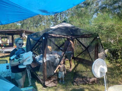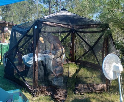 [This review was collected as part of a promotion.] My family members and I have some property on the outskirts of town that we use for our get-togethers, so when offered the opportunity to receive this Clam Quick-Set Escape Sky Camper Portable Outdoor Canopy in exchange for my honest opinion, I readily accepted. So glad I did, because it's even easier to set up and tear down than I imagined it would be. Simple to follow illustrated instructions for set-up are included. The pop up design is amazing and the 7 deluxe tent stakes, along with sturdy tie down ropes kept the canopy in place without issue. The canopy is constructed from 210-denier Poly Oxford fabric. It is sturdy and water resistant, but Not waterproof. The roof seams are taped for added strength and protection. The No-see-um mesh screens really do keep the bugs out! The wind-sun panels included with this awesome canopy (Not In Photos) are constructed of 150-denier Poly Oxford fabric. I appreciate that each panel is designed with a mesh window to allow the inside air to circulate. The elastic and Velcro strap attachments make installing the panels super simple. As the weather was super nice, we chose to leave them off, which is why they are not in my photos. Our overall experience was very positive! I have no doubt that my family and I will be putting this Clam Quick-Set Escape Sky Camper Portable Outdoor Canopy to use for all future family get-togethers! A+++ Recommendation!