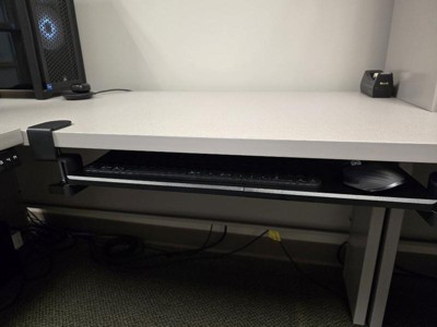 [This review was collected as part of a promotion.] I wanted a keyboard tray but didn't want to drill holes. This tray fit the bill. It works as intended and sits almost flush after installation. The instructions are straightforward. The only negatives I would say is that I am left with the clamps showing on my desk and I'm going to need a shorter mouse to use with it. Otherwise it doesn't everything I need.