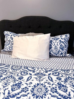 The Clara Blue Reversible Quilt Set by Levtex Home is inspired by antique chic walcoverings. Offered in classic blue and white, this design will immediately transform your bedroom. This reversible quilt features and array of flowers and vines on the front, reversing to a small blue geometric medallions on white on the back. The Quilt and Sham have a cotton front and back, filled with a cotton-rich filler, and are machine washable. Enjoy this for years to come!