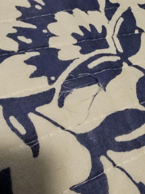 The Clara Blue Reversible Quilt Set by Levtex Home is inspired by antique chic walcoverings. Offered in classic blue and white, this design will immediately transform your bedroom. This reversible quilt features and array of flowers and vines on the front, reversing to a small blue geometric medallions on white on the back. The Quilt and Sham have a cotton front and back, filled with a cotton-rich filler, and are machine washable. Enjoy this for years to come!