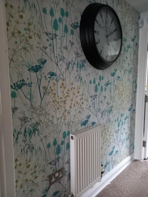 A full roll of this product is 20.5 inches wide and 396 inches long. A full roll can cover up to 56 square feet depending on the design match and pattern repeat. A sample of this product is 8 inches by 11 inches. TheSummer Border Wallpaperis a portrait of a meadow wilderness, in a palette of verdigris, peacock and olive green on an off-white background. The abundant tangle of grasses, teasels, dill seed heads and verbena captures the essence of wild and natural beauty. This wallpaper would make the perfect addition to any living space. Offers a smooth, untextured finish. Offset match with a 39.37 inch repeat.
