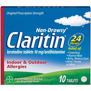 Claritin tablets provide powerful, 24-hour, non-drowsy relief of your worst indoor and outdoor allergy symptoms, including sneezing, runny nose, itchy/watery eyes and itchy throat/nose. Claritin provides relief of symptoms that can be triggered by over 200 different allergens. Claritin is an antihistamine, so it hinders the cascade triggered by allergens. For adults and children ages 6+. One tablet contains 10 mg of loratadine.
