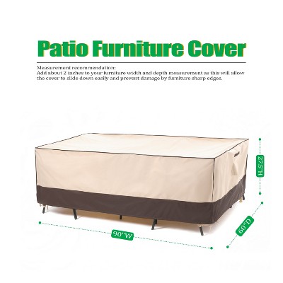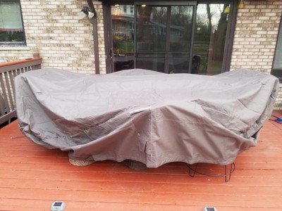 Just received my XL Ravenna Rectangular/Oval Patio Table & Chair Set Cover which I immediately unpacked. This cover absolutely exceeded my expectations with it's thickness, generous size and detailed design. I have an 80 inch stone table with 4 generous sized wicker gliders that fit under this cover with no problems. The elastic bottoms with draw cords, air vents, handles and leg straps really put this above all other covers that I've researched. There's even plenty of room to store 2 large umbrellas and a chiminea. This is certainly a cover and brand I would recommend.