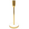 Add an elegant touch to your home decor with this gold taper candle holder on a white marble base. Crafted with a sleek gold finish, this 10"H holder is perfect for displaying your favorite taper candles in style. The sturdy white marble base adds a finishing touch to any room.