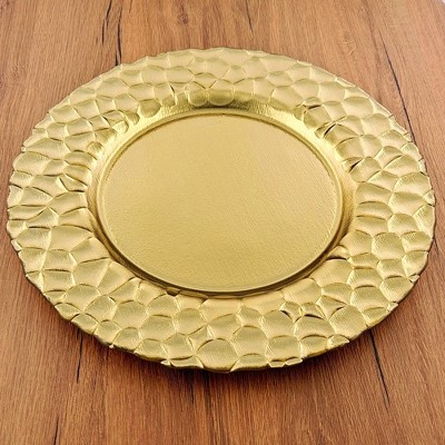 The Trophy Collection embodies the beauty and elements found in the blend of glass and gold leafing. Designed by trained artisans, this collection employs a sensation of modern design combined with an unwavering respect for the classics. Comes in a set of four, this charger plates were decorated with a bold gold scalloped border.
