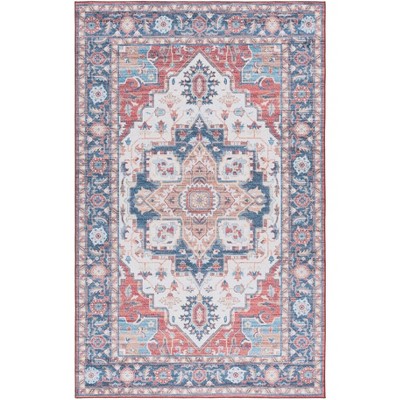 The rich rust and serene blue hues dance together across the rug, creating a harmonious palette that exudes sophistication and warmth. Adorned with an intricate pattern that captures the essence of transitional style, this rug effortlessly bridges the gap between classic charm and modern flair. The ornate design features a central medallion surrounded by floral motifs and geometric borders, paying homage to the artistry of historical textiles while maintaining a fresh, modern appeal.
