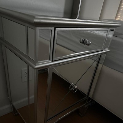 Featuring Hollywood glamour style, the Claudia mirrored end table has a silver lacquered edge and mirrored panels with crosshatch details. The Claudia will add light, sparkle and luxury to your interior as well as space for storing household items. Constructed of MDF and encased with mirror, the Claudia features one drawer and one door with nickel drawer pull and ring. The attached mirrored feet with silver edge elevates the height of the Claudia to go with your arrangement. Made in China, the Claudia will arrive fully-assembled. Dimensions: 29" High x 22" Wide x 16" Deep; Drawers: 4.72" High x 14.49" Wide x 12.6" Deep; Legs: 6.3" High