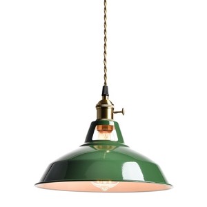 The macaron green pendant light's barn shade and canopy show off a greenfinish while its lamp holder, rotary switch, and hanging cord flaunt a gold finish. The white interior of the barn shade helps reflect the light.