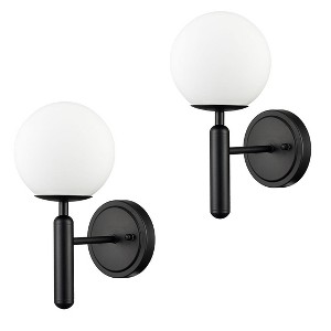 The mid-century modern wall sconces' canopy, arm, and lamp-holder show off a semigloss black finish, conveying understated glamour to your home. Crafted from impurity-free hand-blown opaque opal glass, the wall sconces provide the perfect blend of mid-century modern element and classic touch. Offering a sleek sphere silhouette, they complete the aesthetic with an elegant vibe. Their opal glass shades contrast the black finish and add alluring visual interest to the living space. They bring eye appeal to the space and serve as statement pieces for gracing your bathroom, bedroom, entryway, exterior, hallway, living room, and stairwell.