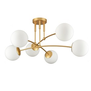 "The modern gold ceiling light's canopy, arms, and lampholders flaunt agold finish, bringing a dash of metallic glitz to your living space. Crafted from impurity-free hand-blown opaque opal glass, the ceiling light provides the perfect blend of mid-century classic and contemporary elements.