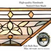 The stained glass sconce shows off floral patterns and the craftsman and mission style.Incorporating both artistic charm and rich colors, the wall sconce adds an instant touch of style and drama to any room. It allows the light to gently filter through the stained glass shade and casts intriguing light effects and shades.