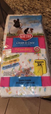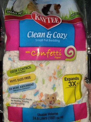 Kaytee Clean & Cozy Confetti small pet paper bedding gives you a whole new standard in super-soft, absorbent bedding. Each pet-safe colored confetti piece unrolls to encourage your small pet’s natural burrowing and nesting instincts. It's a fun and interactive way to promote their natural behaviors! Clean & Cozy bedding is soft and fluffy and absorbs two times more liquid than wood shavings and 6 times its weight in liquid. Clean & Cozy's absorbency means less odor. That's why Clean & Cozy has an odor control guarantee or your money back. Perfect for pet hamsters, mice, gerbils, rabbits, guinea pigs, chinchillas and ferrets.