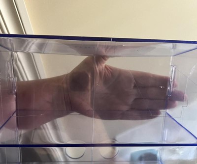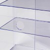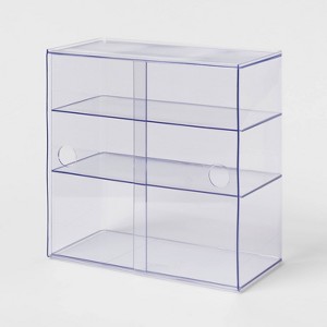 Level up your bathroom organization with this Clear Case with Sliding Doors from Brightroom™. The case is crafted from plastic and has a transparent, blue-tinted construction that allows better visibility and easy access to your essentials while maintaining a stylish look on your vanity counter or shelf. The rectangular organizer features a three-tier silhouette with two sliding doors and cut-out handles, providing covered shelves for convenient storage of your toiletries and cosmetics.