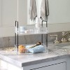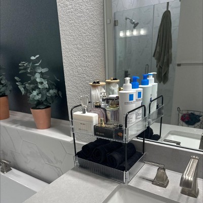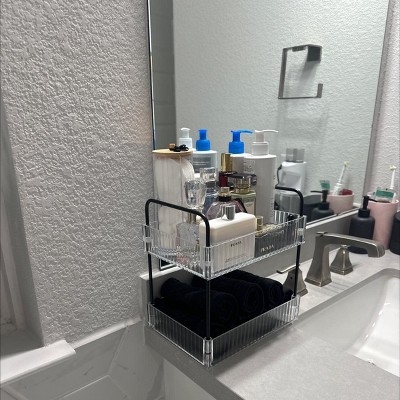 Add a stylish storage solution to your modern bath space with the Clear Ribbed Acrylic Tray from Threshold™. Showcasing a two-tiered design, this clear acrylic tray offers ample space for your makeup brushes, shampoo, towels, and more. The tray comes complete with black sides to create a contrasting look. Designed with handles, it is convenient to move from one place to another.