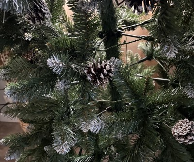 This isn’t even close to the same tree. The tree I received is 7.5 feet tall (I ordered the 6.5). This is a pencil tree with white tips and pinecones…not even close to what I bought.